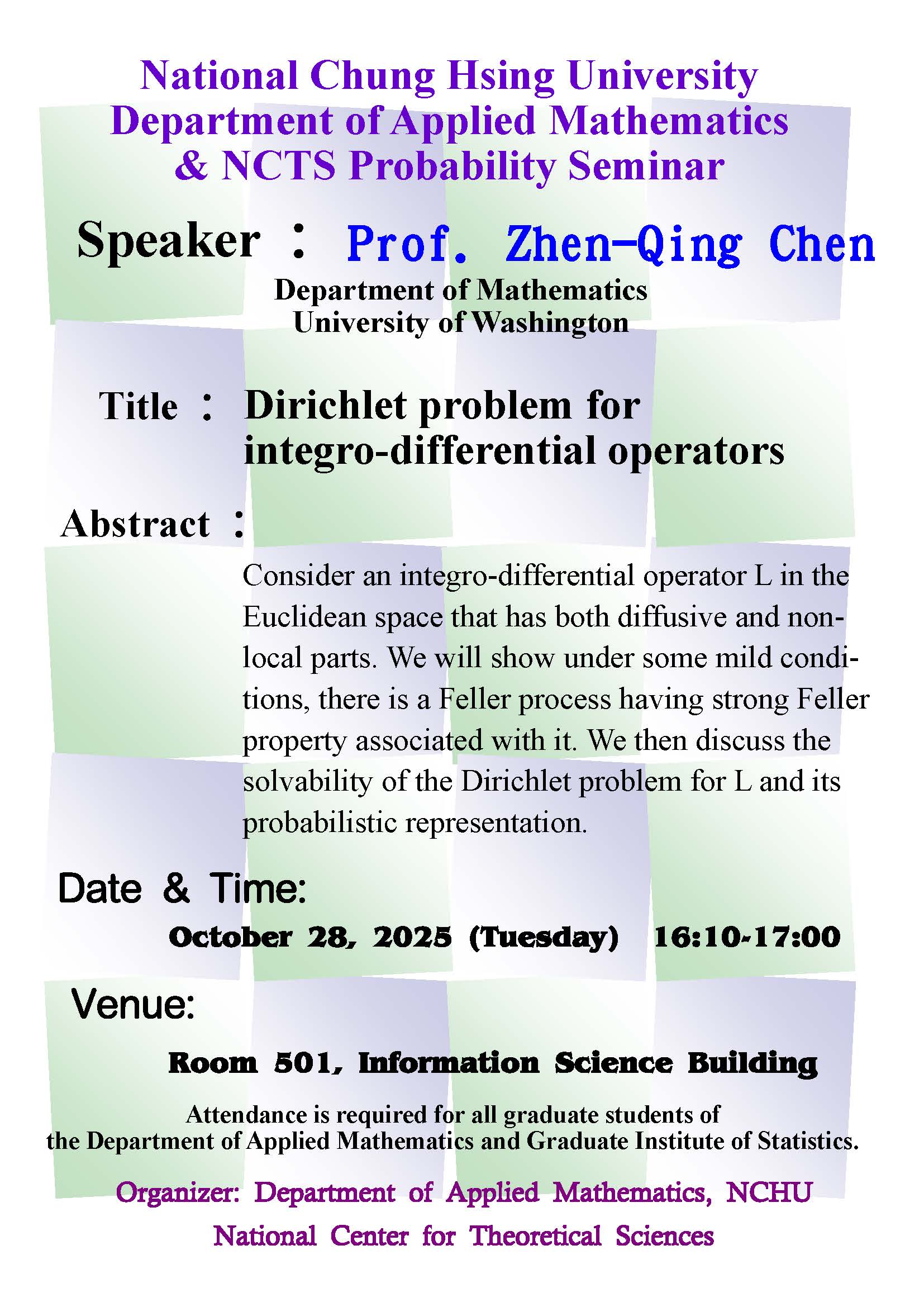 NCHU Department of Applied Mathematics & NCTS Probability Seminar Speaker:Prof. Zhen-Qing Chen (Department of Mathematics University of Washington) Title:Dirichlet problem for integro-differential operators Date & Time: October 28, 2025 (Tuesday) 16:10-17:00 Venue: Room 501, Information Science Building Abstract: Consider an integro-differential operator L in the Euclidean space that has both diffusive and non-local parts. We will show under some mild conditions, there is a Feller process having strong Feller property associated with it. We then discuss the solvability of the Dirichlet problem for L and its probabilistic representation.