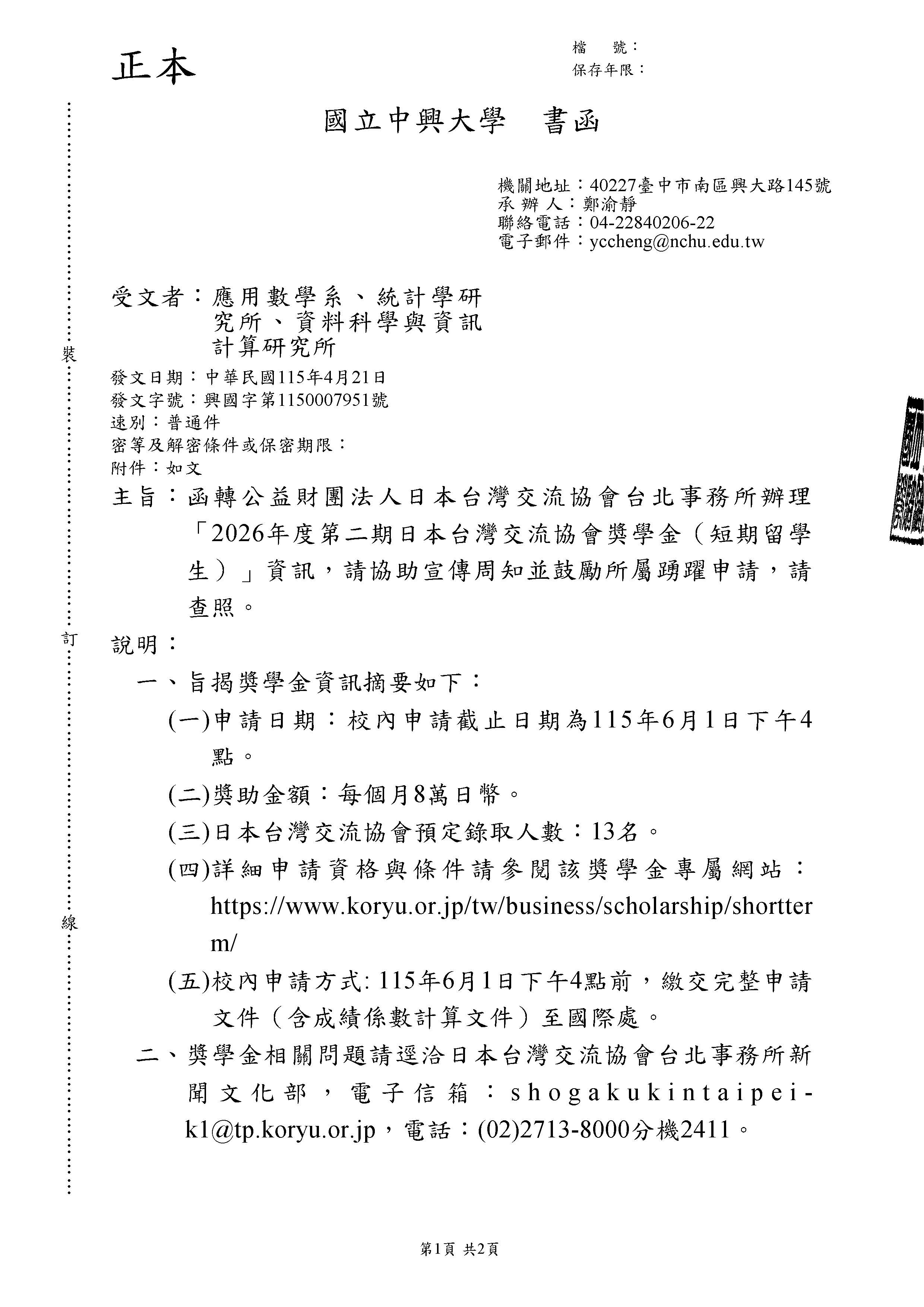 (一)申請日期:校內申請截止日期為115年6月1日下午4 點。