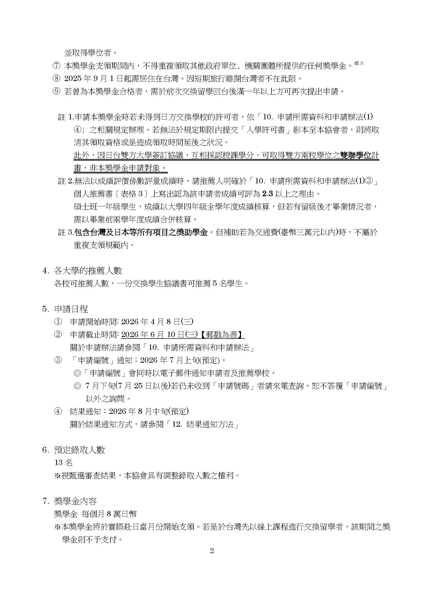 (二)獎助金額:每個月8萬日幣。